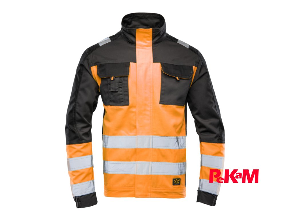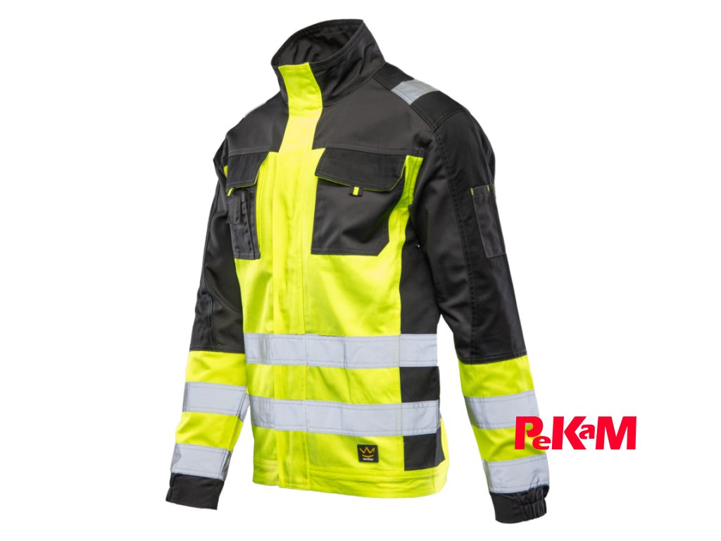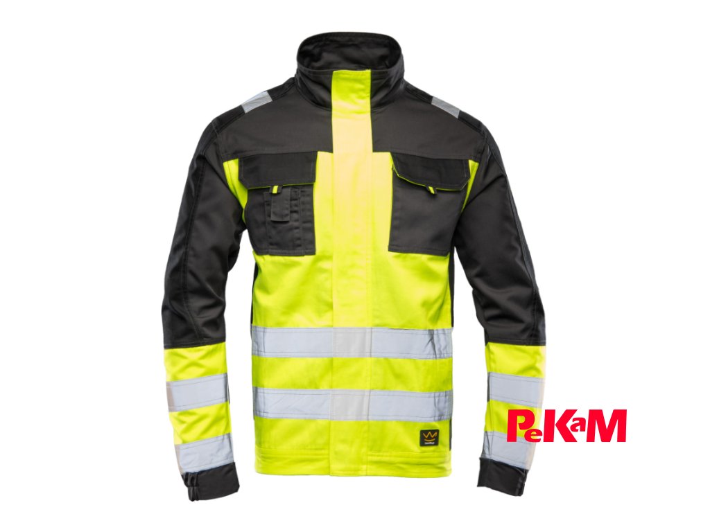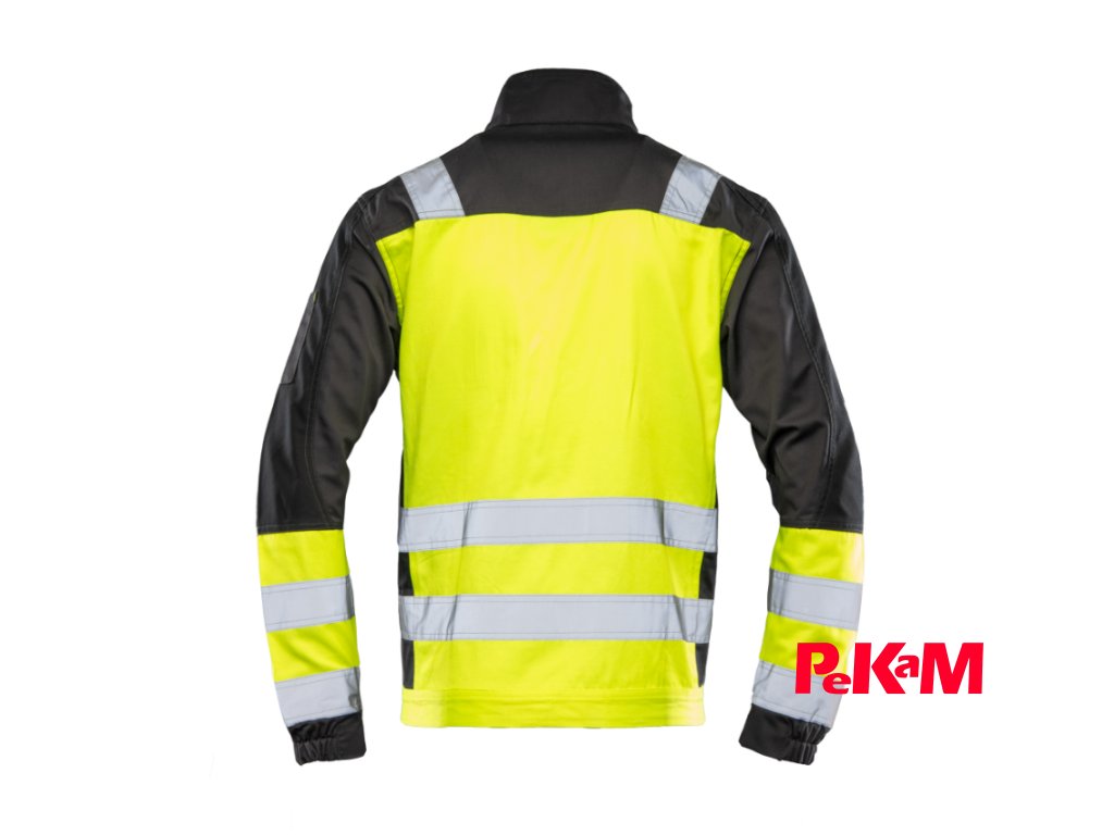 Bezpečnosť pri práci zvyšujú výrazné reflexné prvky — vertikálne aj horizontálne pásy a dvojito prešívané reflexné pruhy široké 5 cm umiestnené na trupe a rukávoch.